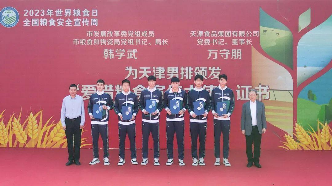 韓學(xué)武、萬守朋為天津食品集團(tuán)男排頒發(fā)“愛惜糧食宣傳大使”證書。旨在進(jìn)一步宣傳節(jié)約光榮、浪費(fèi)可恥的思想觀念,倡導(dǎo)全民健身活動(dòng),倡導(dǎo)健康文明的新生活方式。